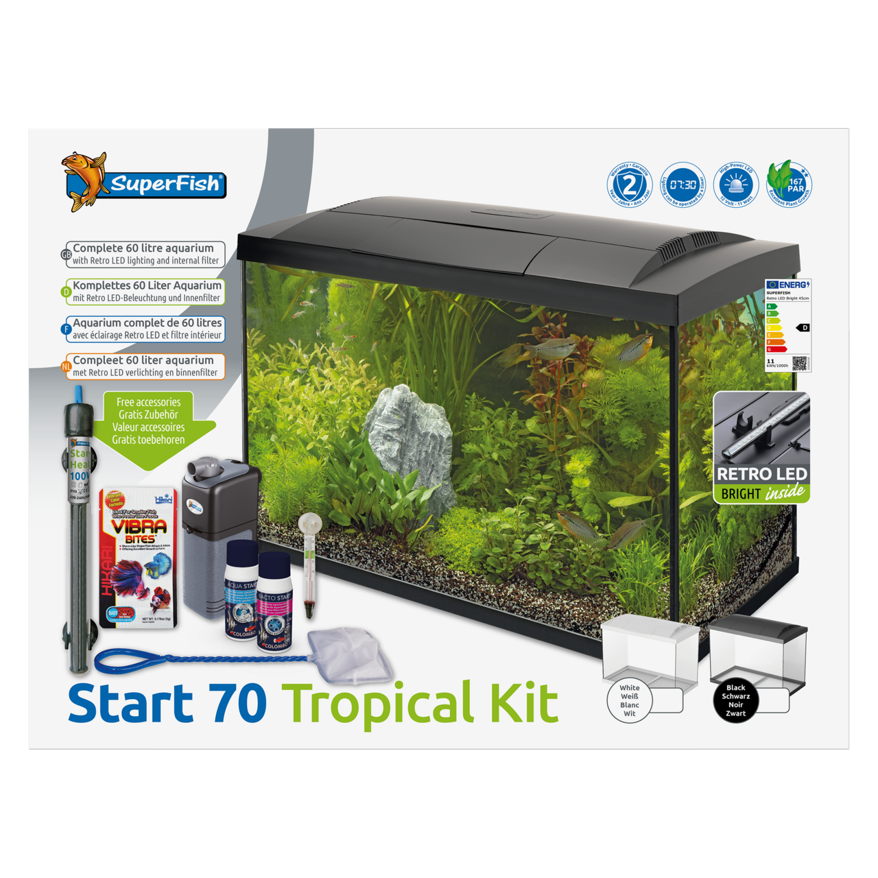 Aquarium kit complet Superfish Start : bac prêt à l’emploi avec éclairage LED, filtre interne Aqua-Flow, chauffage (selon version) et accessoires essentiels pour démarrer facilement l’aquariophilie avec poissons d’eau douce ou tropicaux.